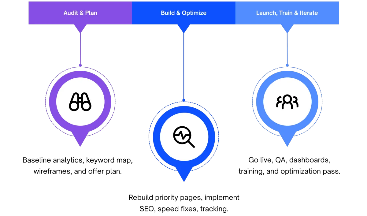 Local SEO options (map pack readiness, NAP, local schema)Tracking & analytics (GA4, pixels, events, dashboards)